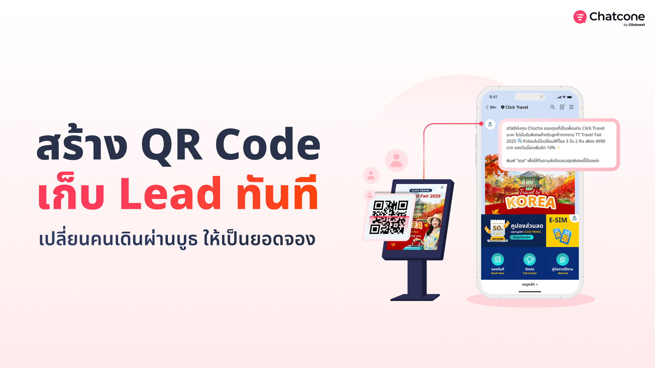 Marketing, News, Success Stories ClickTravel Create QR Code ในงานท่องเที่ยวยังไง? ถึงได้ลูกค้าเพิ่มแบบเห็นผลทันที หากคุณเป็นเจ้าของธุรกิจท่องเที่ยว ไม่ว่าจะเป็นเอเจนซี่ทัวร์ โรงแรม หรือรถเช่า คุณคงคุ้นเคยกับบรรยากาศในงานไทยเที่ยวไทย หรือมหกรรมท่องเที่ยวต่าง ๆ เป็นอย่างดีใช่มั้ย ภาพที่พนักงานยืนแจกโบรชัวร์จนมือระวิง สุดท้ายโบรชัวร์เหล่านั้นก็มักจะถูกทิ้ง หรือยไม่ได้เปิดอ่านอีกเลย วันนี้เราจะพาทุกคนไปส่องกลยุทธ์ที่น่าสนใจมากของ ClickTravel ที่เปลี่ยนการออกบูธแบบเดิม ๆ มาเป็นการ้ Create QR Code เพื่อเก็บ Lead แบบเห็นผลทันทีในงาน จะมีวิธียังไง แล้วธุรกิจคุณเองสามารถนำไปปรับใช้ได้หรือเปล่า ไปดูกันเลย เปลี่ยนจากแจกโบรชัวร์ เป็นสร้างจุดสนใจด้วย QR…