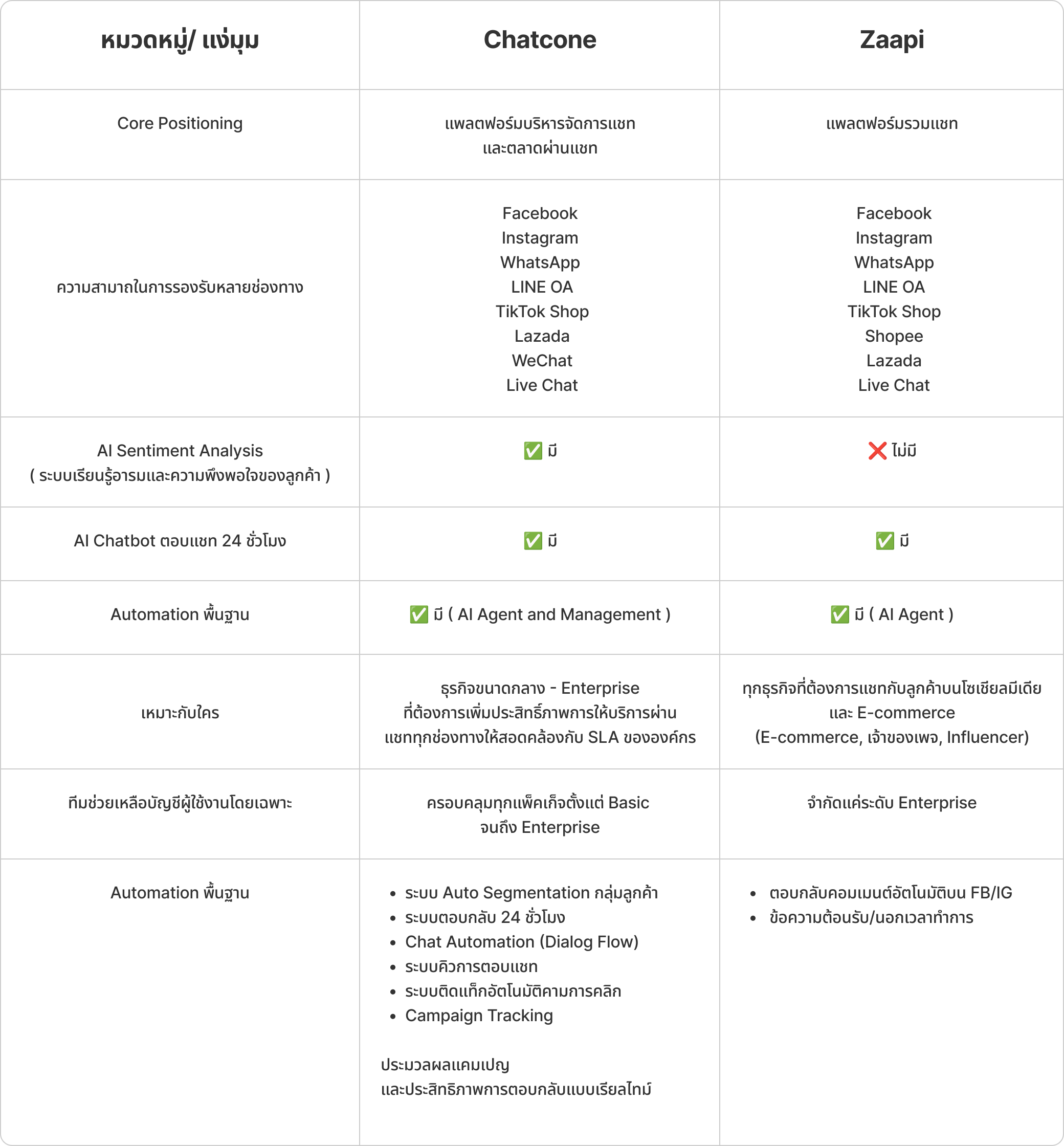 จากตารางเปรียบเทียบ จะเห็นว่าทั้ง Chatcone และ Zaapi ทั้งคู่มี AI Agent เหมือนกัน แต่ต่างกันตรงที่ Chatcone มีระบบ AI Management ที่สามารถให้การวิเคราะห์เชิงลึกให้กับธุรกิจ ด้วย Smart Dashboard ที่สามารถแสดงผลได้ทั้ง Infographics และ Report จะช่วยให้ธุรกิจนำข้อมูลไปวิเคราะห์ เพื่อการปรับปรุง หรือสร้างกลยุทธ์การตลาดใหม่ๆ ได้ในอนาคต