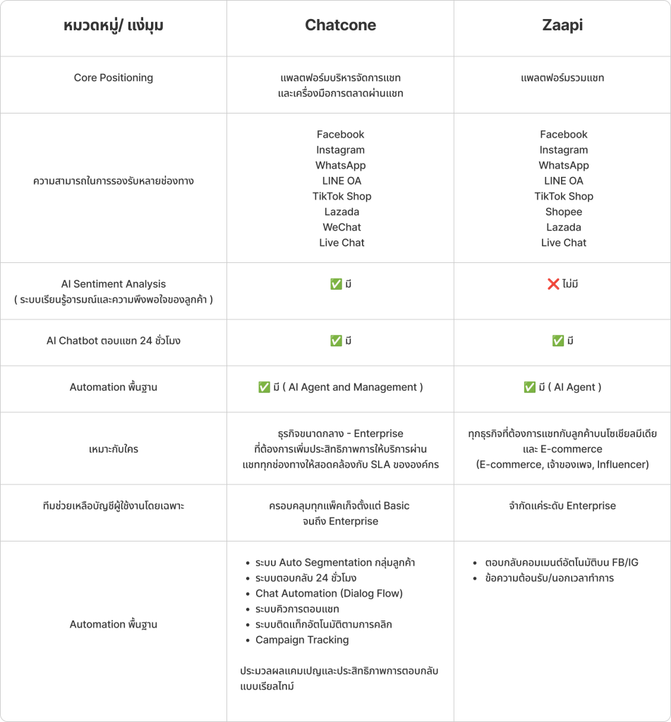 จากตารางเปรียบเทียบ จะเห็นว่าทั้ง Chatcone และ Zaapi ทั้งคู่มี AI Agent เหมือนกัน แต่ต่างกันตรงที่ Chatcone มีระบบ AI Management ที่สามารถให้การวิเคราะห์เชิงลึกให้กับธุรกิจ ด้วย Smart Dashboard ที่สามารถแสดงผลได้ทั้ง Infographics และ Report จะช่วยให้ธุรกิจนำข้อมูลไปวิเคราะห์ เพื่อการปรับปรุง หรือสร้างกลยุทธ์การตลาดใหม่ ๆ ได้ในอนาคต